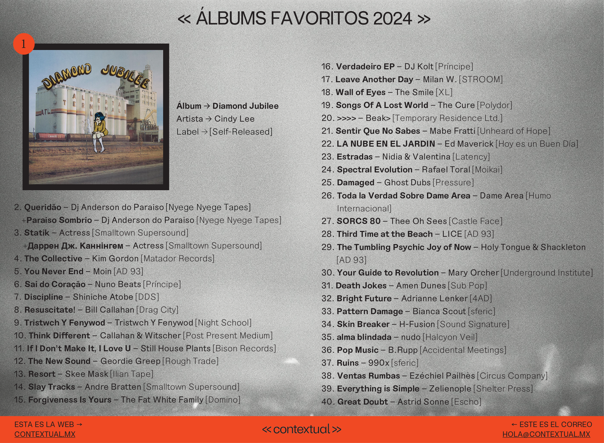 Parece que Pitchfork decidió hacer una especie de comeback a sus raíces indie al detonar el buzz alrededor de Diamond Jubilee de Cindy Lee: la antítesis de disco del año. La mística del sitio se había perdido con la venta al gigante Condé Nast en 2015, pero se exacerbó con la crisis de identidad que empató con el dominio cultural brutal del pop de la última década [que, ojo, no está mal, pero esa línea se cruzaba tenue e interesantemente durante sus años dorados cuando lo dirigía Ryan Schreiber]. Todo indicaba que la agonía de esa deriva conceptual iba a empeorar en 2024 cuando anunciaron que se integrarían como vertical en GQ para recortar gastos y personal, generando todo un debate sobre el estado del periodismo musical independiente a nivel global. Y no obstante, el reducido equipo editorial de Pitchfork cierra este 2024 ubicando al de Cindy Lee como “mejor álbum” por encima de los lanzados por Charlie XCX, Beyoncé, Billie Eilish o Kendrick Lamar, entre otros nombres dominantes; lo increíble es que lo acompañaron, además, de una selección de 50 discos que, francamente y como ex-lector, parecen más un statement de su regreso como taste-makers que una radiografía del momento cultural.