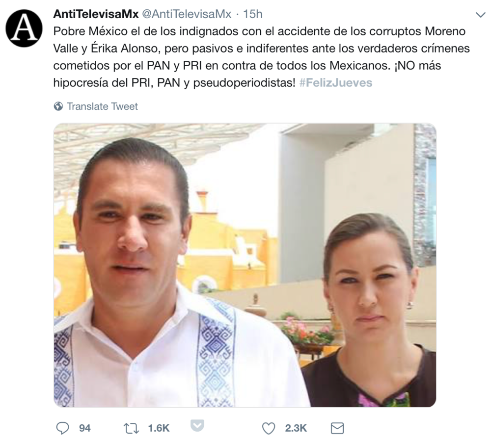 La cuenta es descaradamente pro-AMLO y anti-PRIAN. Con un simple scroll se descubre una agenda anti-fifí totalmente volcada hacia la 4T. Lo que más me sorprende (o no 🤷🏻♂️) es que a @AntiTelevisaMx la siguen cuatro cuentas de conocidos.