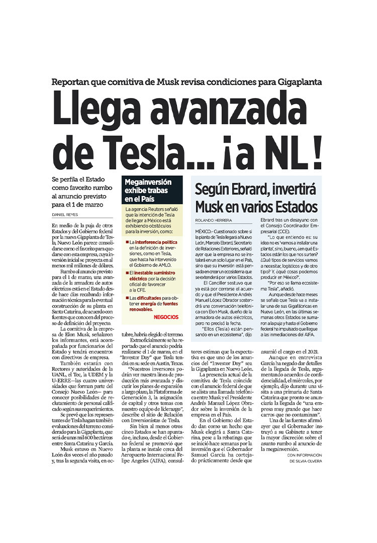 Esa pugna, además, es mediada principalmente por el periódico El Norte de Grupo Reforma, con un periodismo que está alcanzando niveles de “híper-regionalismo activista“. Con titulares de portada que van desde la confrontación [«Busca 4T agandallar planta de Tesla en NL»] y hasta el entusiasmo desbordado [«Llega avanzada de Tesla... ¡a NL!»], la cobertura del periódico parece más una labor de convencimiento que de análisis.